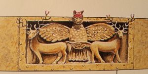 Месопотамский бог войны Имдугуд имел облик орла с головой льва в окружении двух оленей, символов плодовитости. Изображение на портале храма близ города Ур.