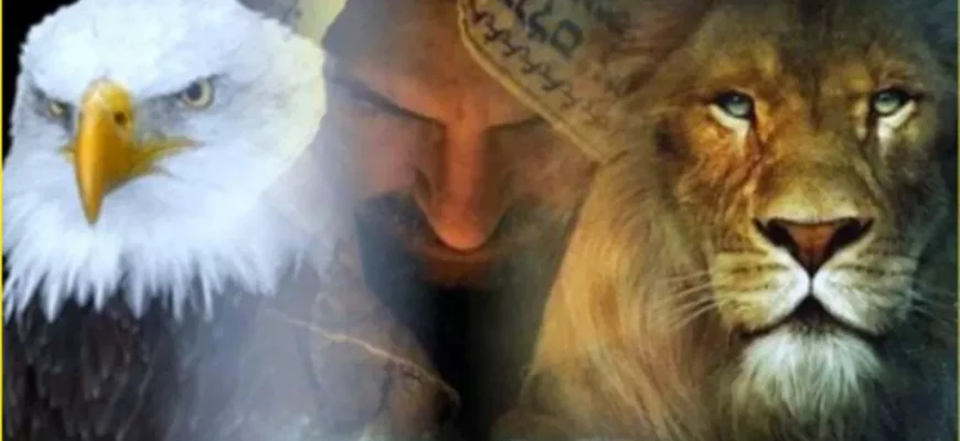 Месопотамский бог войны Имдугуд имел облик орла с головой льва в окружении двух оленей, символов плодовитости. Изображение на портале храма близ города Ур.